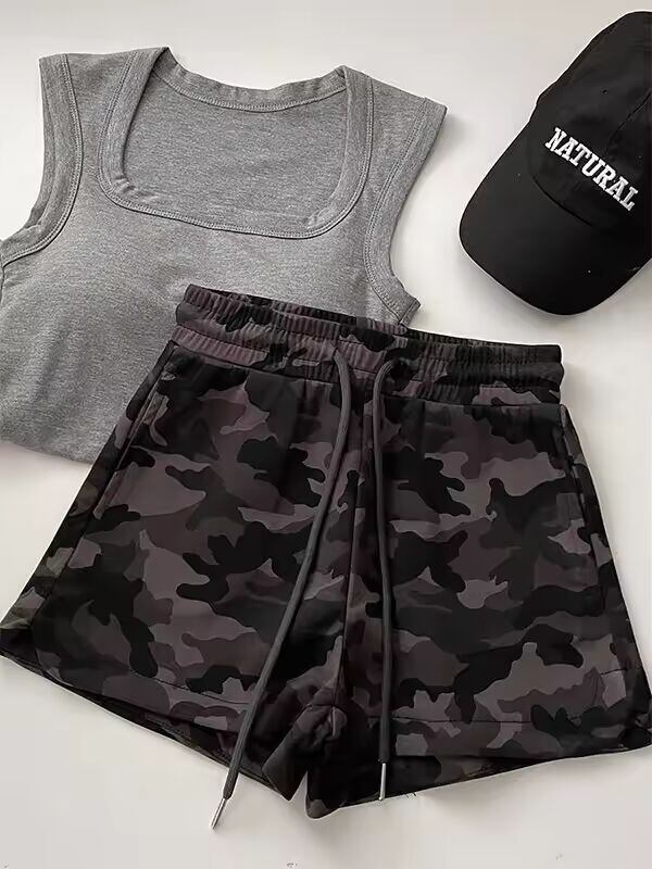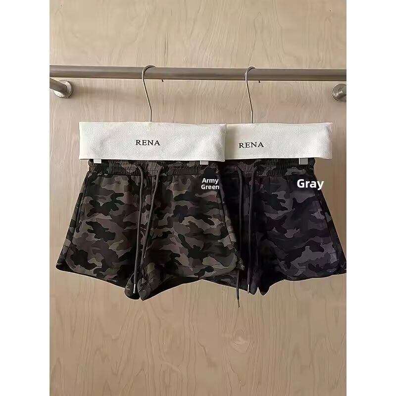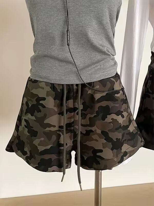 【送料無料◎】 ミレニアルホットガールアメリカンレトロ夏快適な弾性ウエストドローストリングカジュアルショート丈迷彩ショーツトレンディ