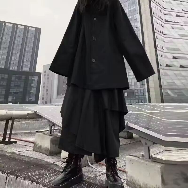 【送料無料◎】 黒ワイドレッグパンツルーズ弾性ウエストカジュアルスカートパンツハイウエストポリエステル繊維普通の厚さ9点丈