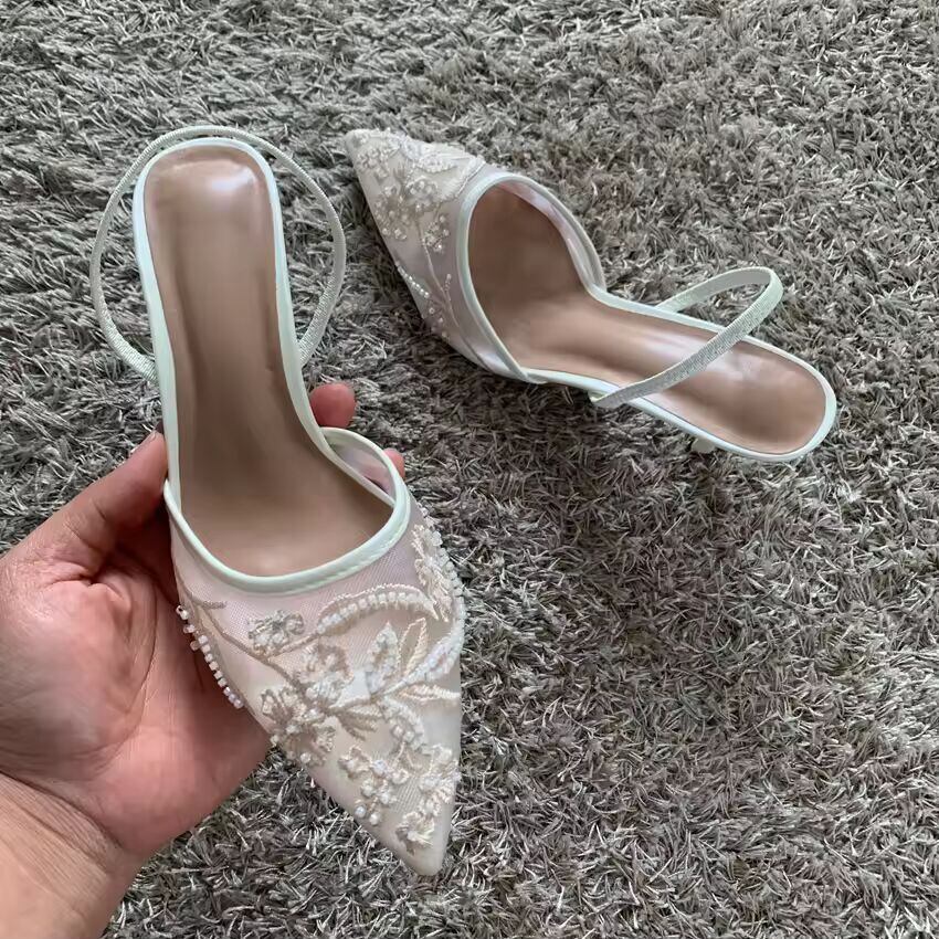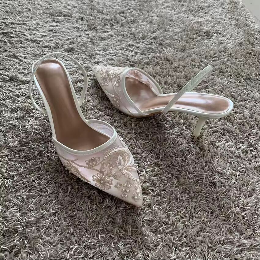 【送料無料◎】 メッシュ刺繍薄型ハイヒールサンダル女性 2025 夏のセクシーなスリングバックポインテッドトゥパンプスドレスシューズ女性 Sandalias デ Mujer