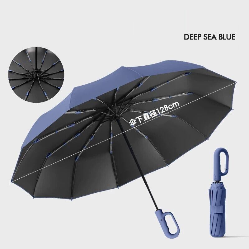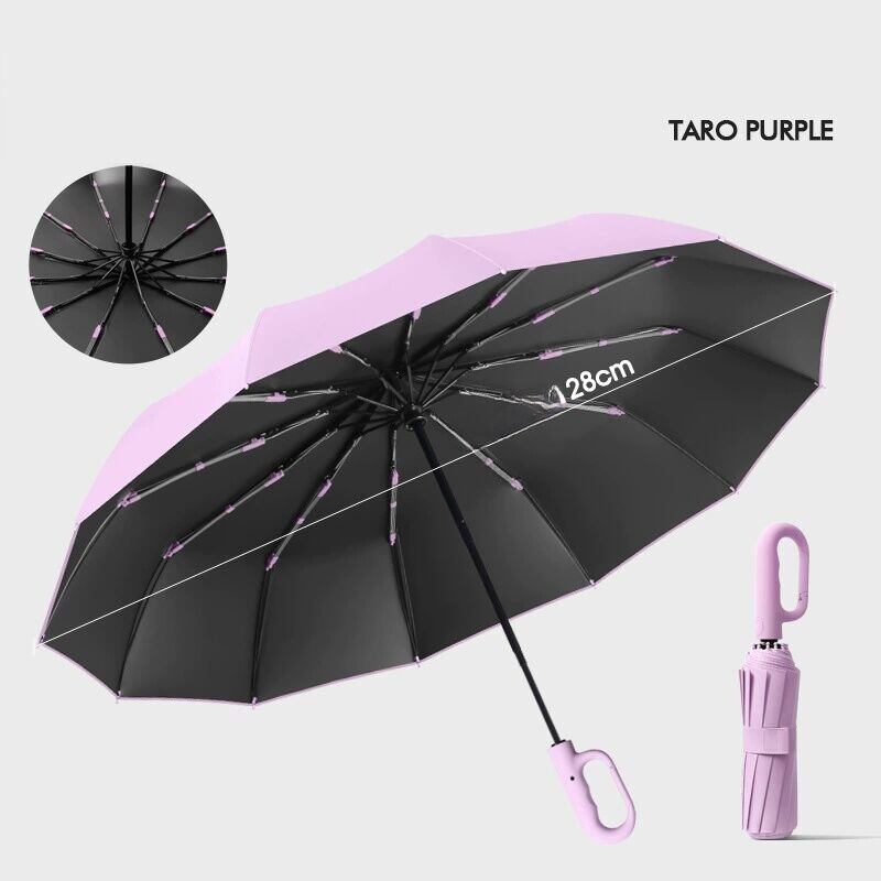 【送料無料◎】 特大 12 ボーン リング バックル傘前方全自動ポータブル耐風性兼用折りたたみ雨黒接着剤うーん