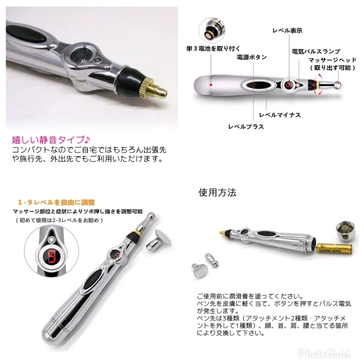 ご使用前に潤滑膏を塗ってください。ペン先を皮膚に軽く当て、ボタンを押すとパルス電気が発生します。ペン先は3種類(アタッチメント2種類・アタッチメントを外して1種類)、顔、首、肩、腰と当てる箇所により交換して下さい。