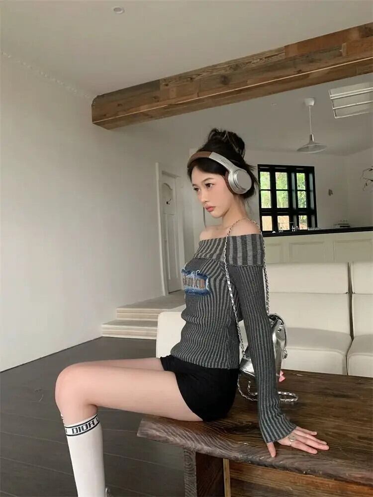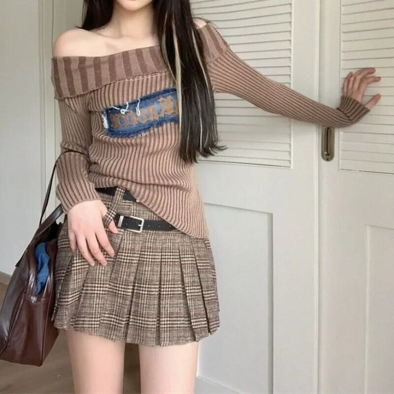 送料無料 アパレル Deeptown Y2k サイバーブラウンストライプ Tシャツ女性ヴィンテージグランジ長袖 Tシャツパンクストリートオフショルダースリムニットトップス ロング ビンテージ AE121288787736143814484 | mihatudai(みはつばい)ネットショッピングならmihatudai
