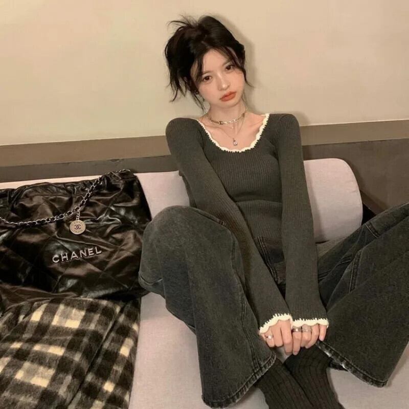 送料無料 アパレル Deeptown スタイルグレーニット Tシャツ女性コケットヴィンテージ長袖 Tシャツアメリカのレトロなフリルオーバーサイズルーズトップス ロング ラッフル ビンテージ AE121288787752825854266 | mihatudai(みはつばい)ネットショッピングならmihatudai