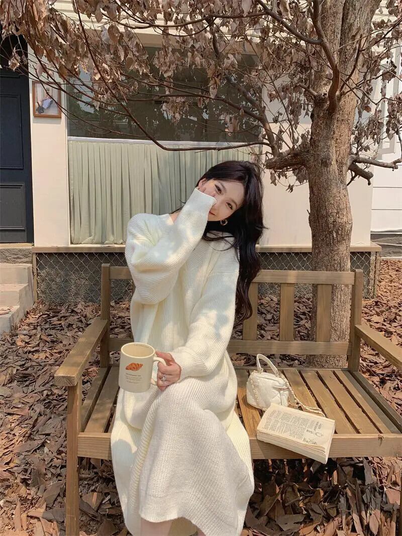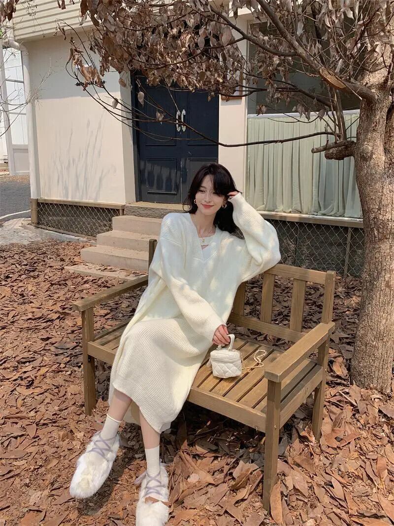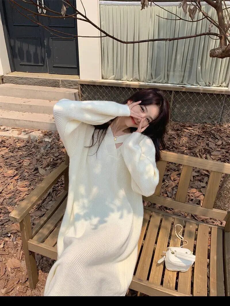 送料無料 アパレル Deeptown スタイルミディニットワンピースドレス女性フレンチカットアウト長袖冬ドレス白 Vestidos ロング ホワイト ウィンター 冬物 AE121288787792713957446 | mihatudai(みはつばい)ネットショッピングならmihatudai