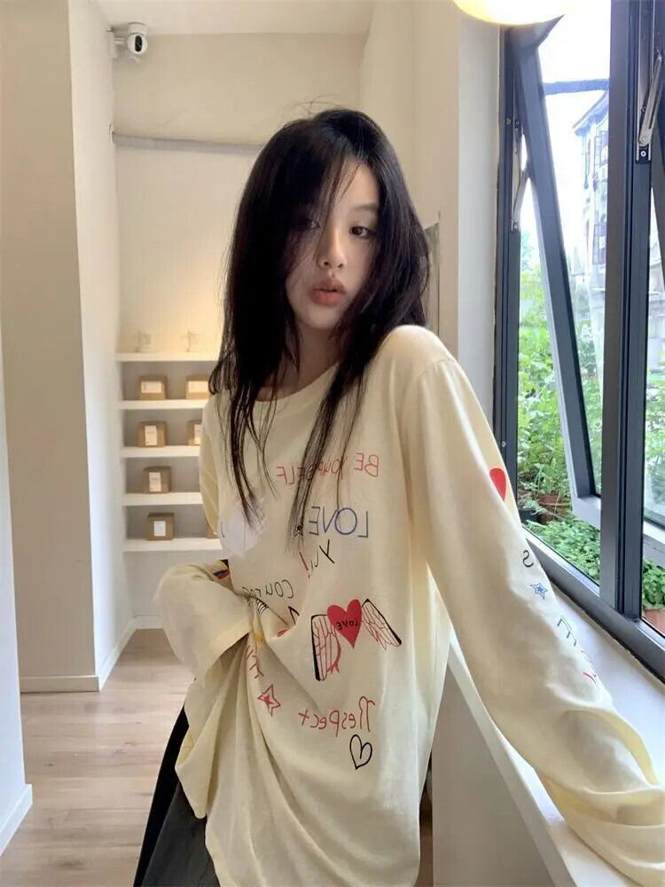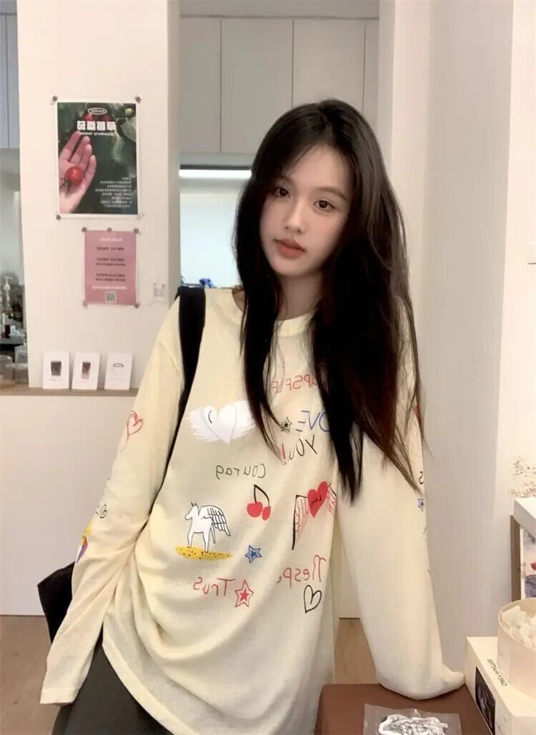 送料無料 アパレル Deeptown スタイルかわいい漫画ベージュ Tシャツ女性 Y2k 甘い長袖 Tシャツ E 原宿特大ルーズ Tシャツ ロング 大人ガーリー スウィート キュート カジュアル AE121288787772871905636 | mihatudai(みはつばい)ネットショッピングならmihatudai