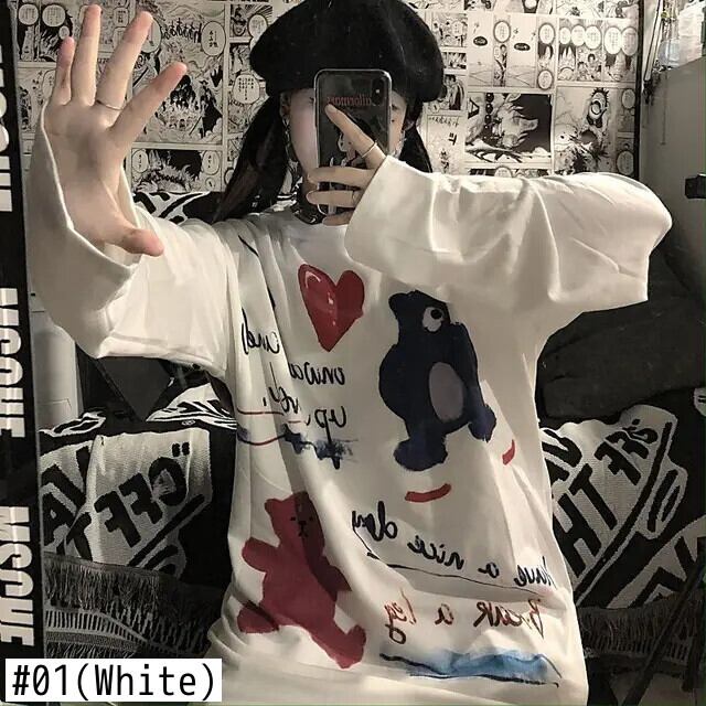 送料無料 アパレル Deeptown 原宿クマ白 Tシャツ女性長袖 Tシャツエモ ese ヒッピーストリートオーバーサイズルーズトップス ロング ホワイト かわいい AE121288787793876119383 | mihatudai(みはつばい)ネットショッピングならmihatudai