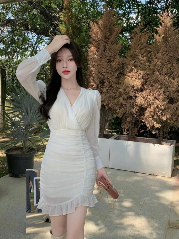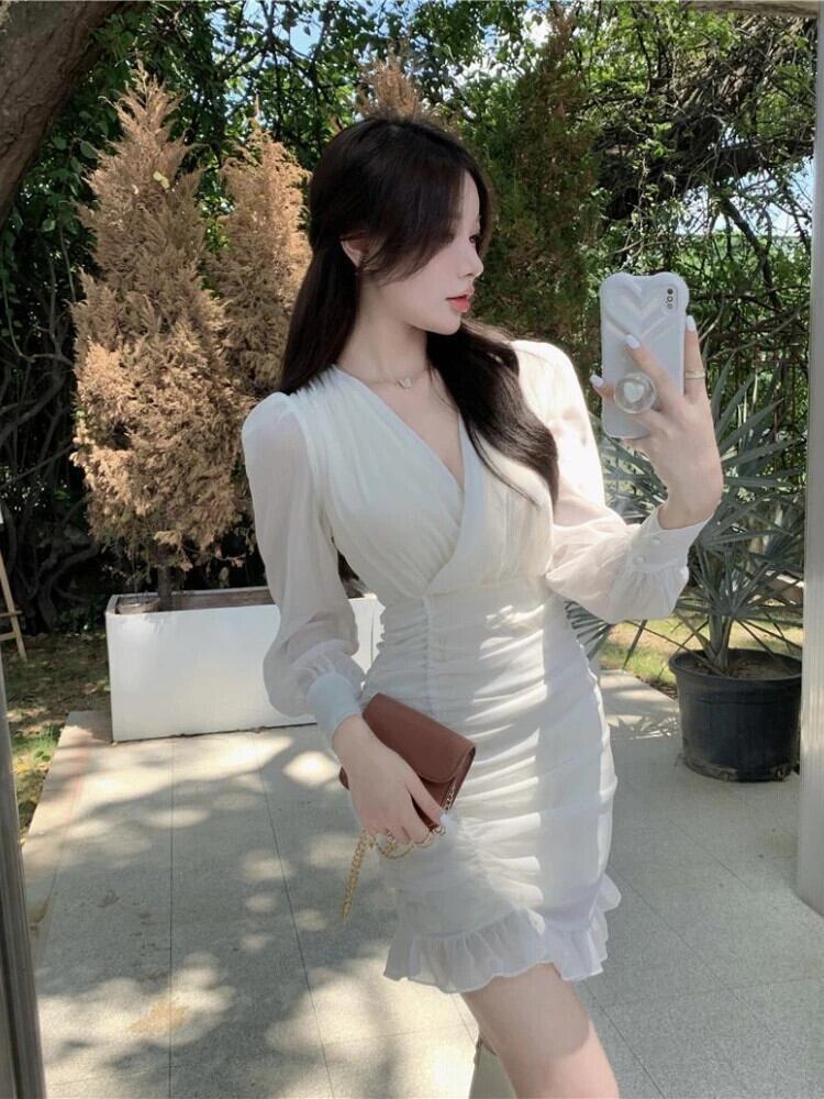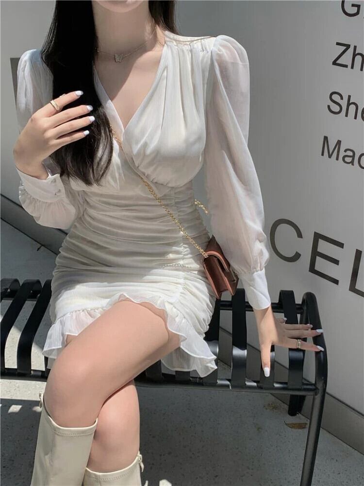 送料無料 アパレル Deeptown Y2k フェアリーコアミニホワイトチュニックドレス女性スタイルセクシーなフリルひだ長袖ボディコーンシフォンドレス秋 ロング ラッフル オータム 秋物 AE121288787713888873486 | mihatudai(みはつばい)ネットショッピングならmihatudai