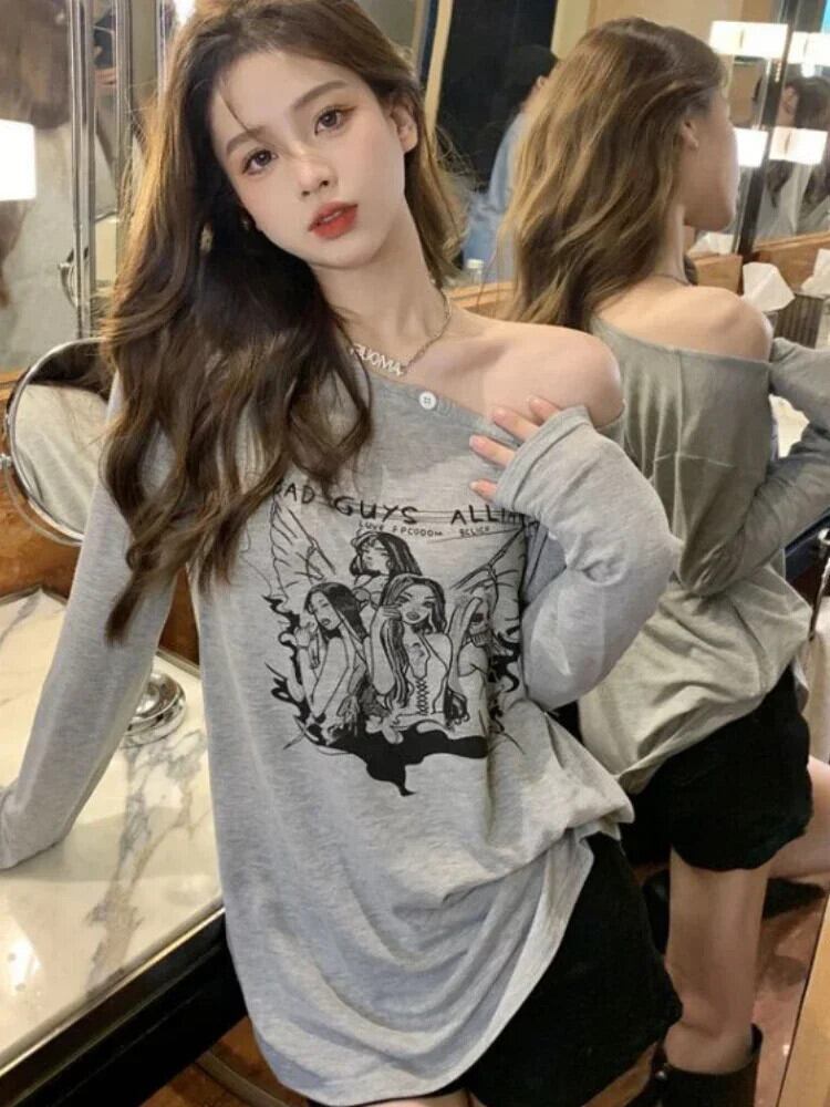 送料無料 アパレル Deeptown コケットオフショルダーベージュ Tシャツ女性 Y2k スタイル不規則な長袖オーバーサイズトップスレビュー多くの服 ロング AE121288787771110851718 | mihatudai(みはつばい)ネットショッピングならmihatudai