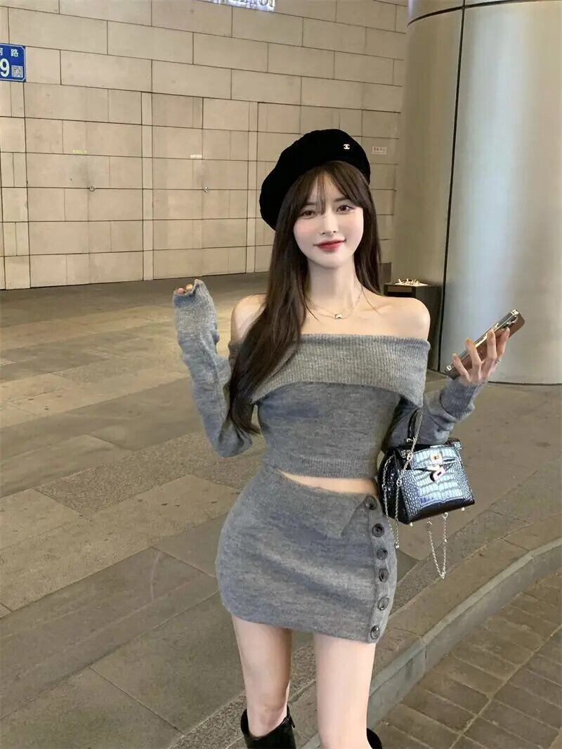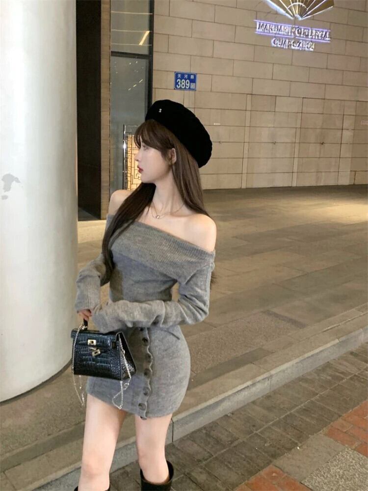 送料無料 アパレル Deeptown コケットセクシーなグレーツーピースドレス女性スタイルのセクシーな長袖スラッシュネックボディコーンニットドレスセット冬 ロング ウィンター 冬物 AE121288787711365438982 | mihatudai(みはつばい)ネットショッピングならmihatudai