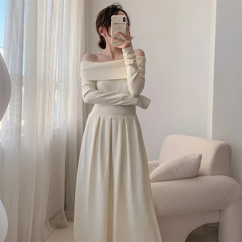 送料無料 アパレル Deeptown スタイルミディニットワンピースドレス女性フレンチヴィンテージ折り目スラッシュネック長袖ベージュチュニックドレス ロング ビンテージ AE121288787768254341864 | mihatudai(みはつばい)ネットショッピングならmihatudai