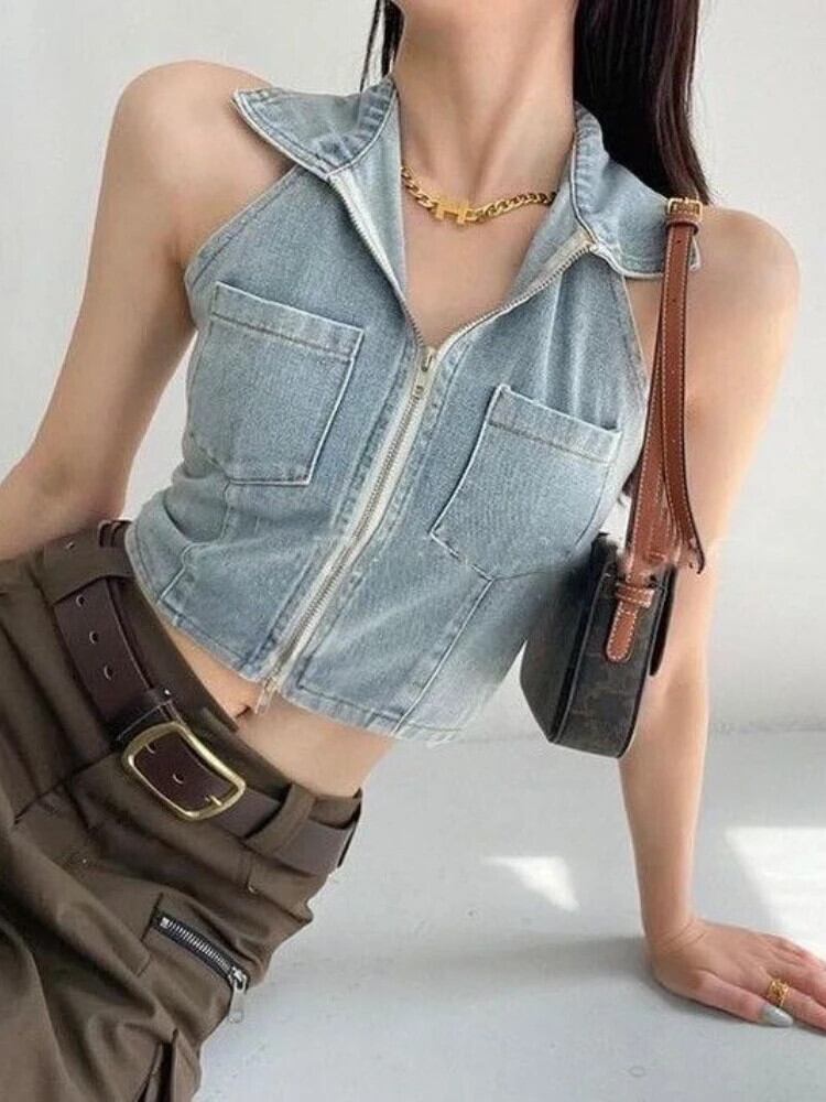 送料無料 アパレル Deeptown ヴィンテージデニムタンクトップ女性原宿セクシーなスリムホルターバックレスベスト夏ジッパーノースリーブ Y2K クロップトップスストリート かわいい サマー 夏物 ビンテージ AE121288787767100085034 | mihatudai(みはつばい)ネットショッピングならmihatudai