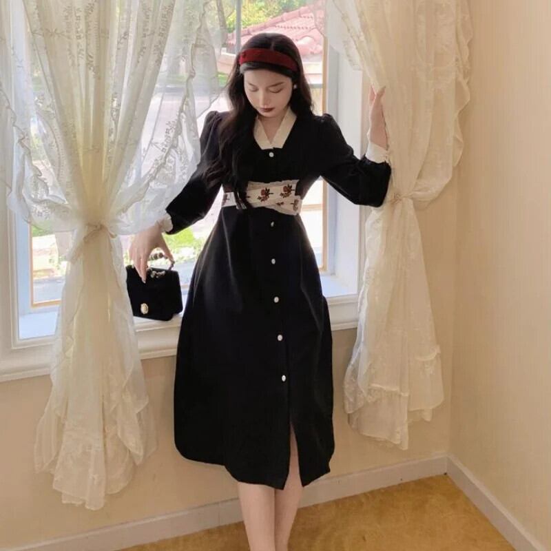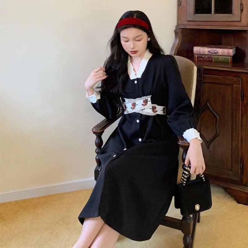 送料無料 アパレル Deeptown ヴィンテージシックな黒のシャツドレス女性スタイル花柄ワンピースウエスト長袖チュニックブラウスドレス ロング ブラック ビンテージ AE121288787753332548767 | mihatudai(みはつばい)ネットショッピングならmihatudai