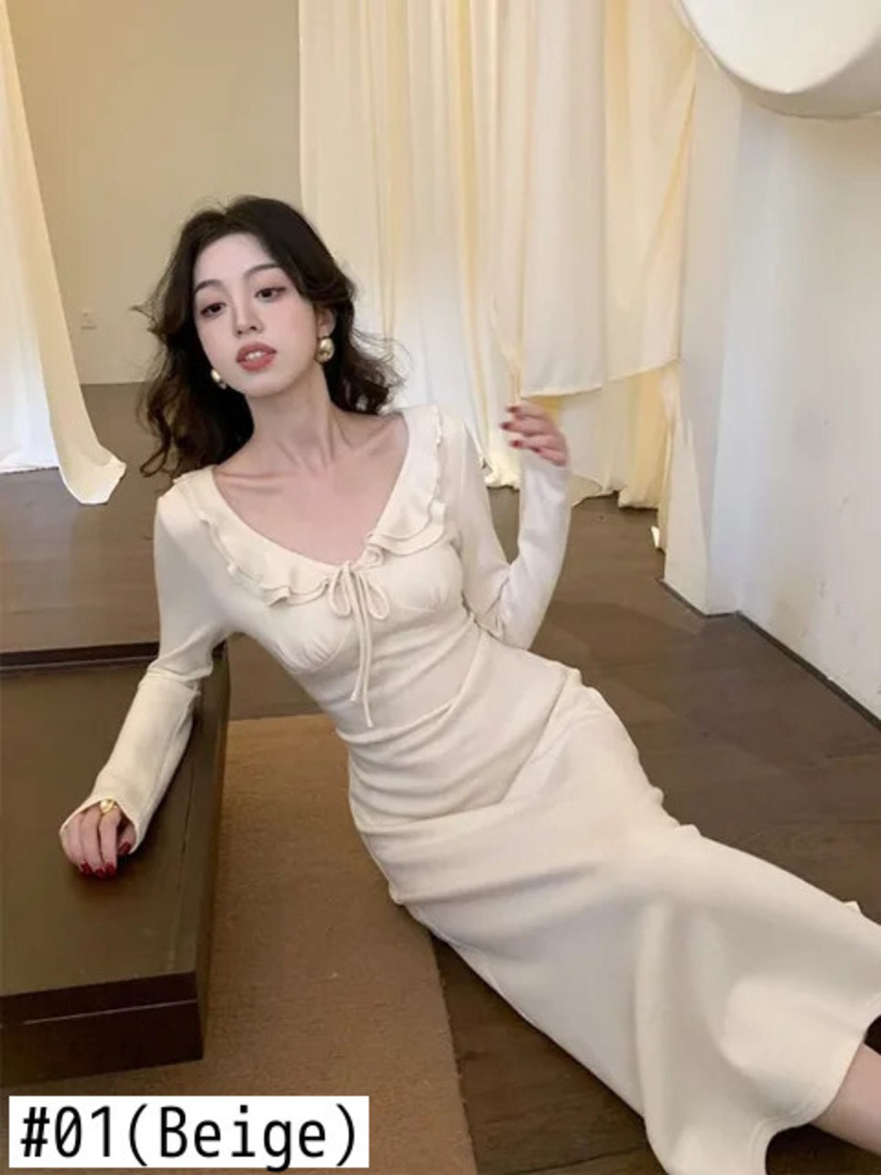 送料無料 アパレル Deeptown スタイルシックなベージュミディドレス女性フレンチフリル長袖ボディコーンイブニングドレスコケット Vestidos ロング ラッフル AE121288787737428904460 | mihatudai(みはつばい)ネットショッピングならmihatudai