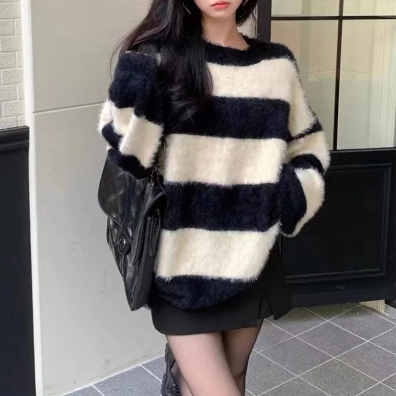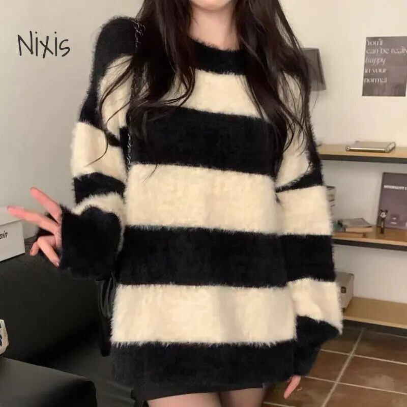 送料無料 アパレル レトロストライプセーター女性ルーズラウンドネックニット暖かい服長袖トップ秋冬 Y2k ロング オータム 秋物 ウィンター 冬物 Oネック AE12128878730784231259 | mihatudai(みはつばい)ネットショッピングならmihatudai