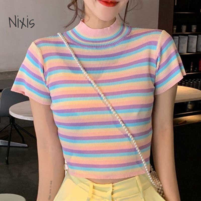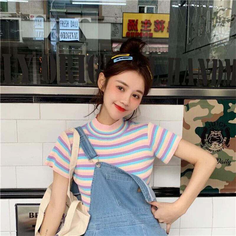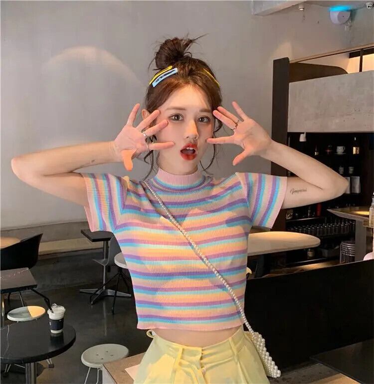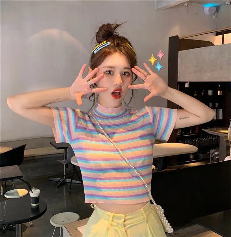 送料無料 アパレル 夏のレインボーストライプ Tシャツ女性 2023 スリムフィット半袖ニットトップスヴィンテージオールマッチスタイル サマー 夏物 ビンテージ AE12128878797418043012 | mihatudai(みはつばい)ネットショッピングならmihatudai