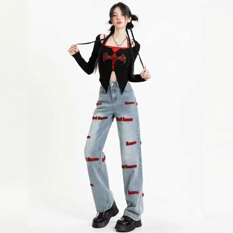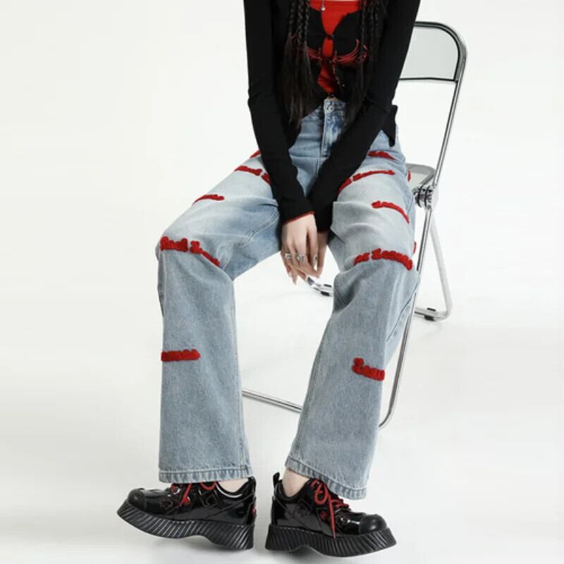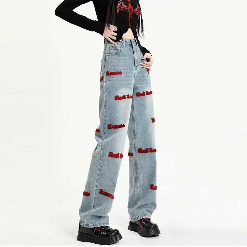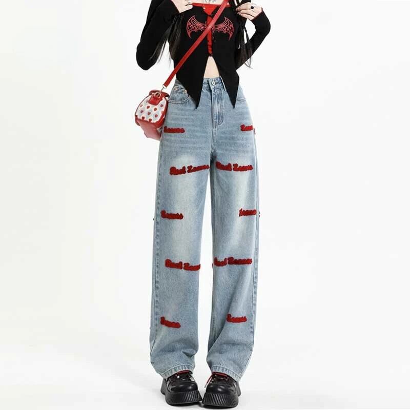送料無料 アパレル 刺繍ストレートジーンズ女性の春アメリカンスタイルレトロデニムパンツ原宿だぶだぶワイドレッグパンツストリート Y2K レッド かわいい スプリング 春物 AE12128878751886750482 | mihatudai(みはつばい)ネットショッピングならmihatudai