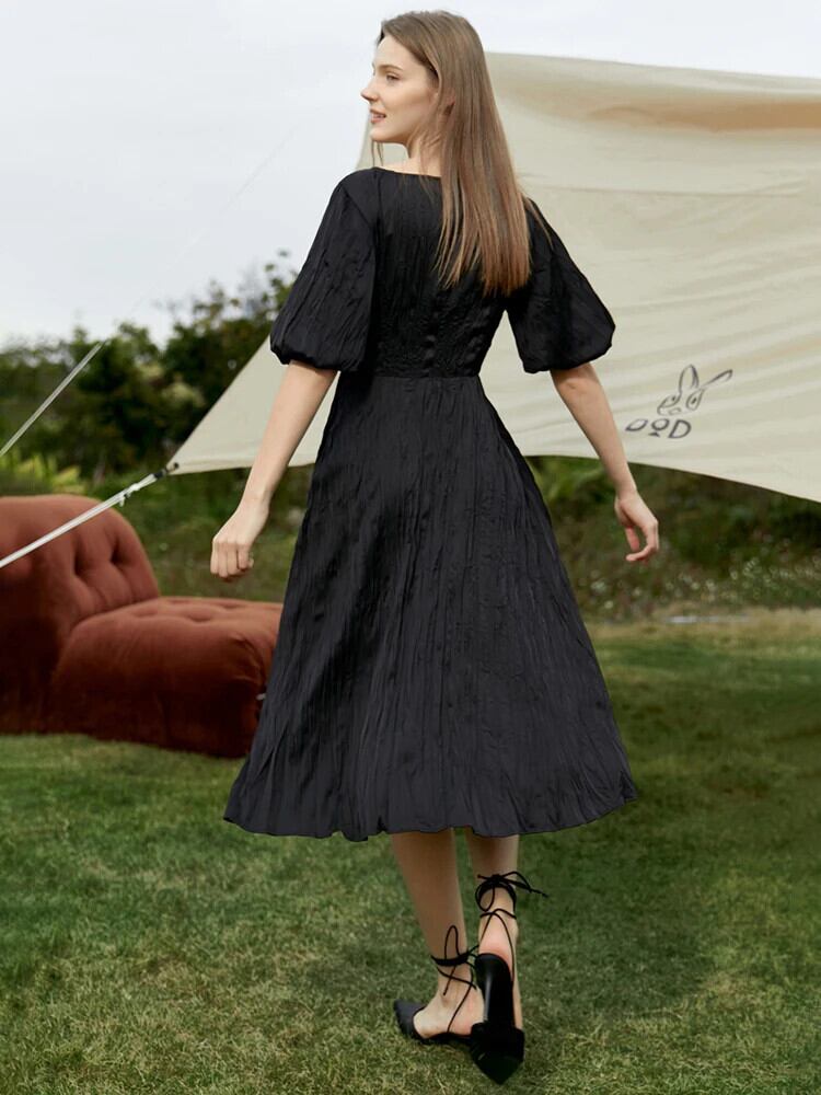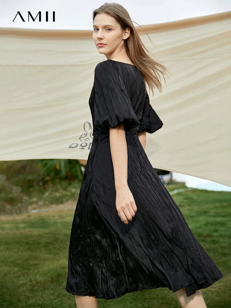 送料無料 アパレル AMII ミニマリズムドレス女性 2022 夏パフスリーブソリッド O ネックミッドカーフニッチ Vestidos 12270044 サマー 夏物 Oネック ソリッドカラー AE121222391423243214