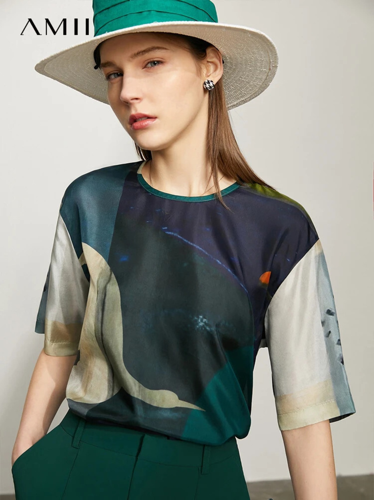 送料無料 アパレル AMII ミニマリズムシャツ女性プリントルーズシャツリアルシルクオフィスレディ半袖ブラウストップス Tシャツ 12140388 ショート ハーフスリーブ 会社 学校 通勤や通学にも AE121222361302532408