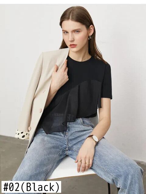 送料無料 アパレル AMII ミニマリズムシャツレディーストップス 2022 夏パッチワークオフィスレディフリルルーズコントラスト Tシャツ女性 12270195 ラッフル サマー 夏物 会社 学校 通勤や通学にも AE121222382376947859
