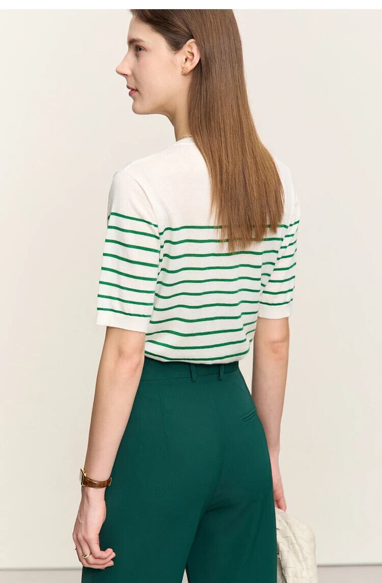 送料無料 アパレル AMII ミニマリズムフレンチ半袖女性ニットルーズストライプ対照的な色 2023 夏トップス 12342646 ショート ハーフスリーブ サマー 夏物 AE121222334442767074