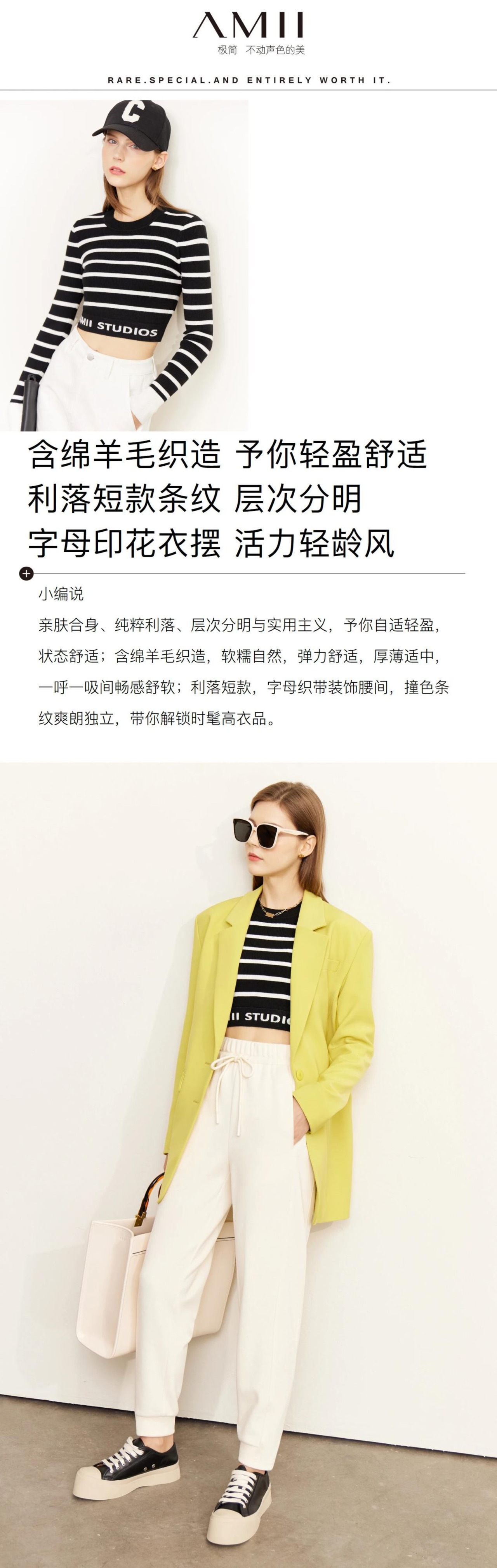 送料無料 アパレル AMII ミニマリズムニット Sweatert 女性秋 Oneck ストライプフルスリーブレタートップスセクシーなショート 12240934 オータム 秋物 AE121222388707647026