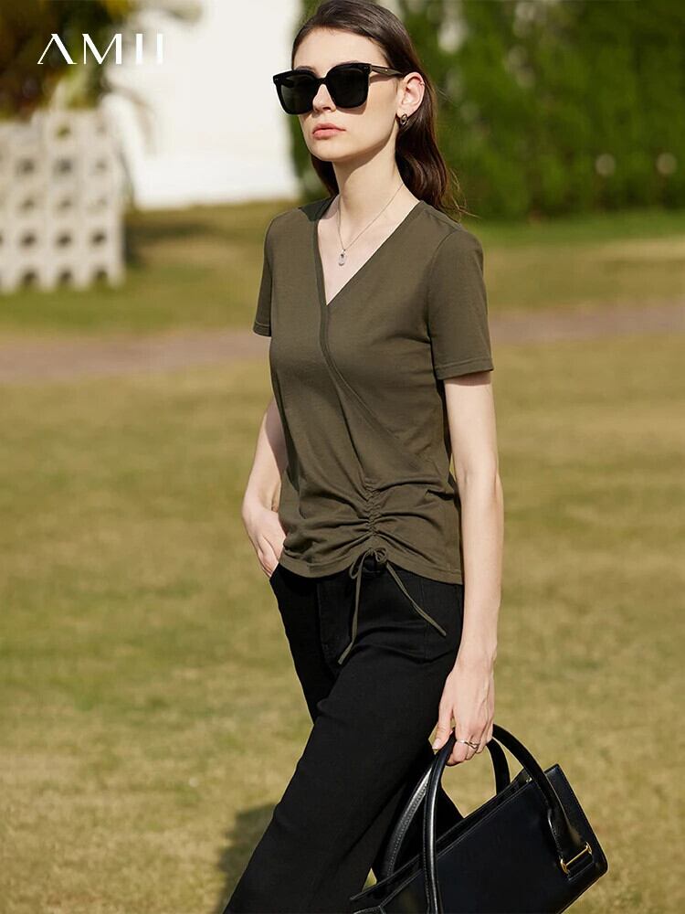 送料無料 アパレル AMII ミニマリズム 2023 夏 Tシャツ 綿100% Vネック OL シャーリング Tシャツ 12230276 コットン サマー 夏物 会社 学校 通勤や通学にも AE121222373353253207 | mihatudai(みはつばい)ネットショッピングならmihatudai
