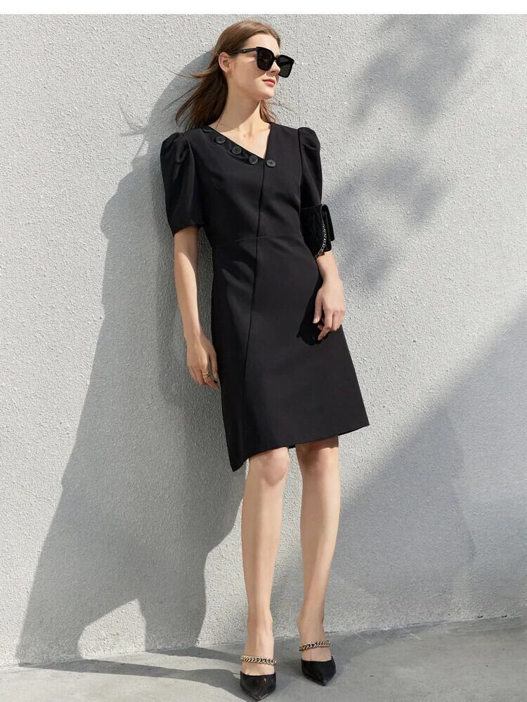 送料無料 アパレル Amii ミニマリズム 2022 サマードレスオフィスレディ V ネックパフスリーブボタン Aline ミディドレス女性 12230067 夏物 Vネック 会社 学校 通勤や通学にも AE121222391635365142 | mihatudai(みはつばい)ネットショッピングならmihatudai