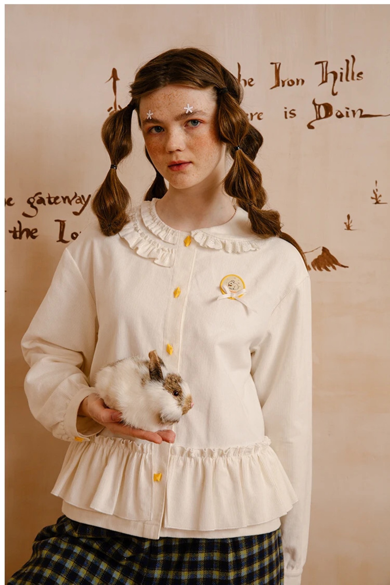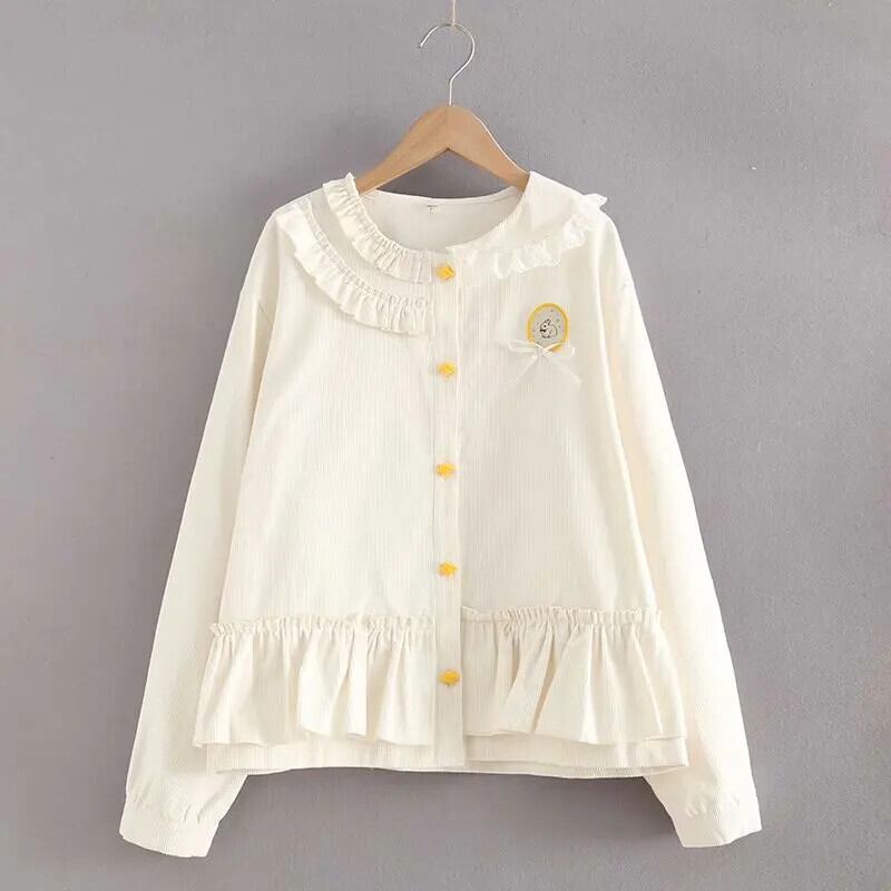 送料無料 アパレル コーデュロイ漫画刺繍ブラウス女性 2020 冬長袖フリルネックシャツ甘いスタイルの基本トップス ロング ラッフル 大人ガーリー スウィート キュート カジュアル ウィンター 冬物 AE12120080827972474368