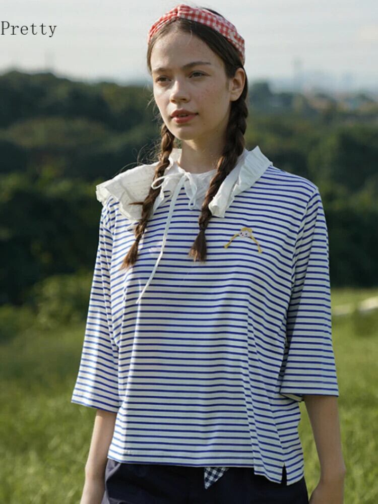 送料無料 アパレル 女性漫画刺繍ストライプコットン Tシャツプルオーバー 2023 夏半袖 O ネックレースパッチワーク基本トップス ハーフスリーブ サマー 夏物 Oネック AE12120080840463739284 | mihatudai(みはつばい)ネットショッピングならmihatudai