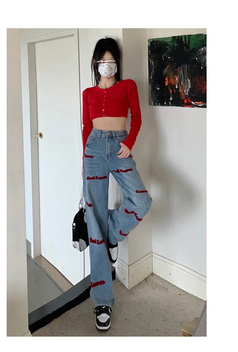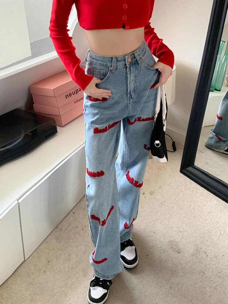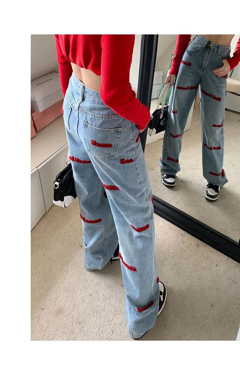 送料無料 アパレル JMPRS 春アメリカン刺繍ストレートレッグジーンズ女性ニッチワイドレッグデミンパンツ Y2k ウエストジーンズ レッド スプリング 春物 ワイドパンツ AE122232251354417290 | mihatudai(みはつばい)ネットショッピングならmihatudai