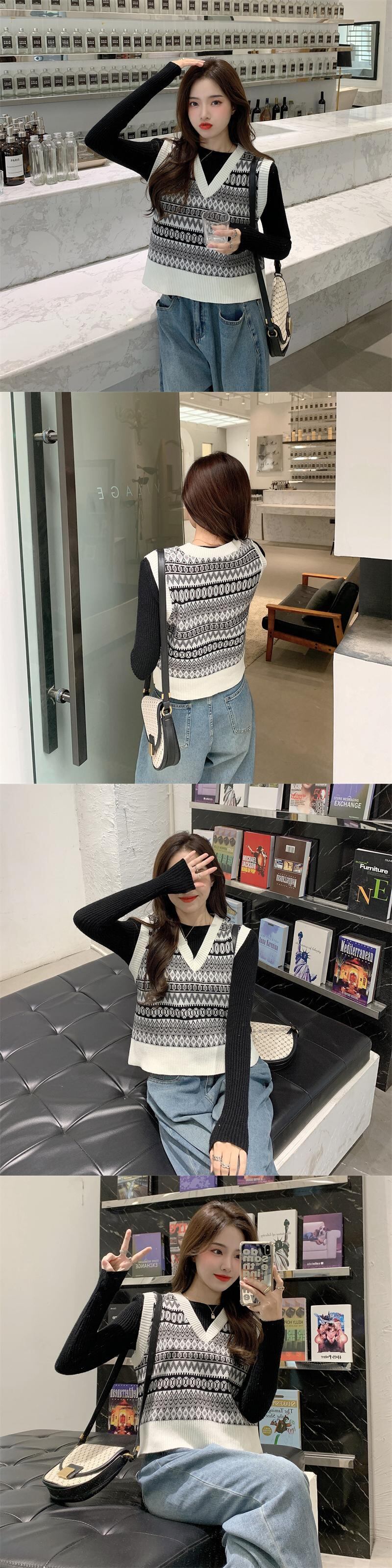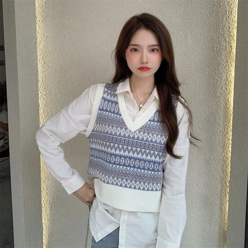 送料無料 アパレル 秋 2021 ヴィンテージニットセーターベスト女性 ese プレッピースタイル V ネッククロップドトップス学生プルオーバーベスト Vネック ビンテージ AE12223222579276702