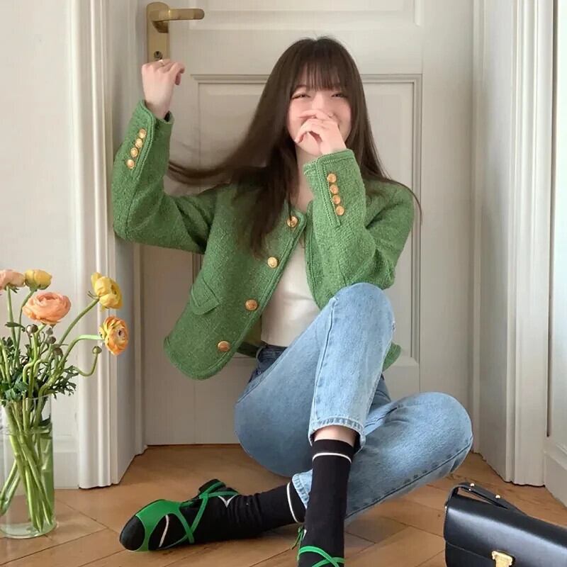 送料無料 アパレル 女性グリーンツイードクロップドジャケット O ネック長袖オフィスレディショートコート秋冬ジャケット生き抜く ロング オータム 秋物 ウィンター 冬物 Oネック 会社 学校 通勤や通学にも AE122232217091502598 | mihatudai(みはつばい)ネットショッピングならmihatudai