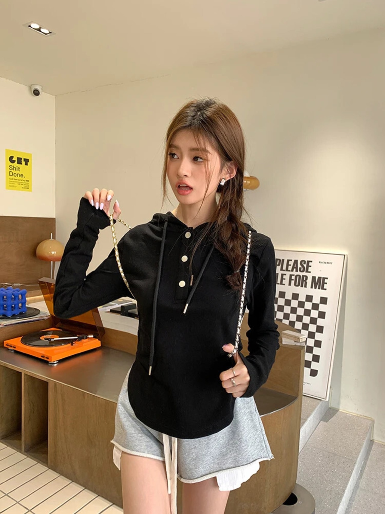 送料無料 アパレル 秋のフード付き Tシャツ女性長袖スリムフィットトップスボタン無地スポーツ Y2k ロング オータム 秋物 ソリッドカラー AE122232219503012955 | mihatudai(みはつばい)ネットショッピングならmihatudai