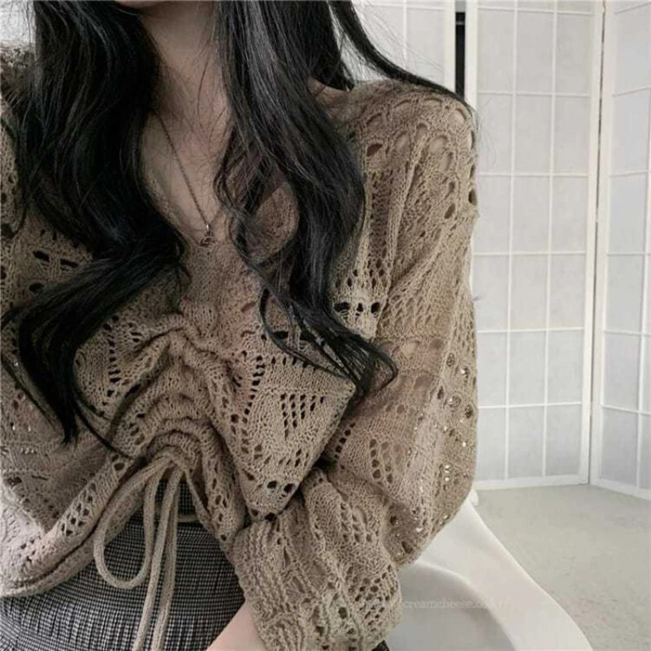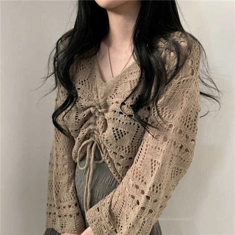 送料無料 アパレル 中空アウトプルオーバー女性 Y2k 怠惰なスタイル長袖カーキセータートップスセクシーな V ネックプリーツストリートジャンパー ロング Vネック AE122232222530373668 | mihatudai(みはつばい)ネットショッピングならmihatudai