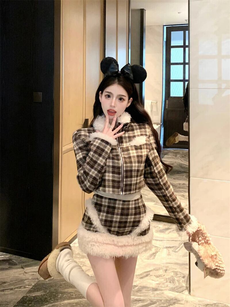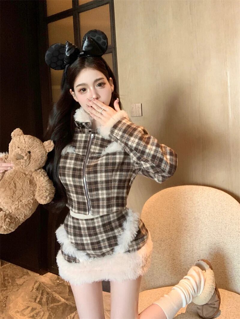 送料無料 アパレル 秋冬チェック柄ツイード毛皮の襟 2 枚セット女性のセクシーなフリースパッチワーク丈ジャケット Y2k ミニスカートセット オータム 秋物 ウィンター 冬物 AE122232221573377135 | mihatudai(みはつばい)ネットショッピングならmihatudai