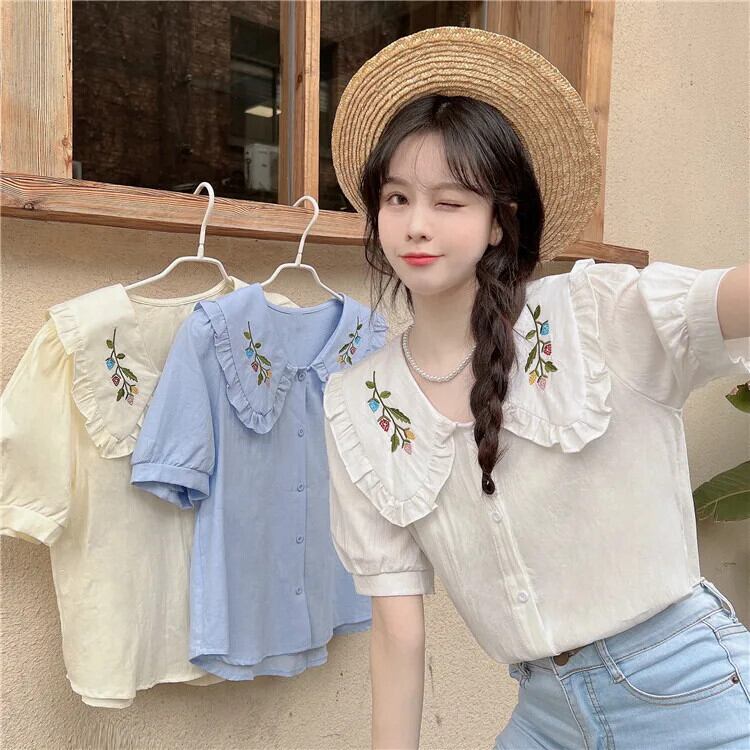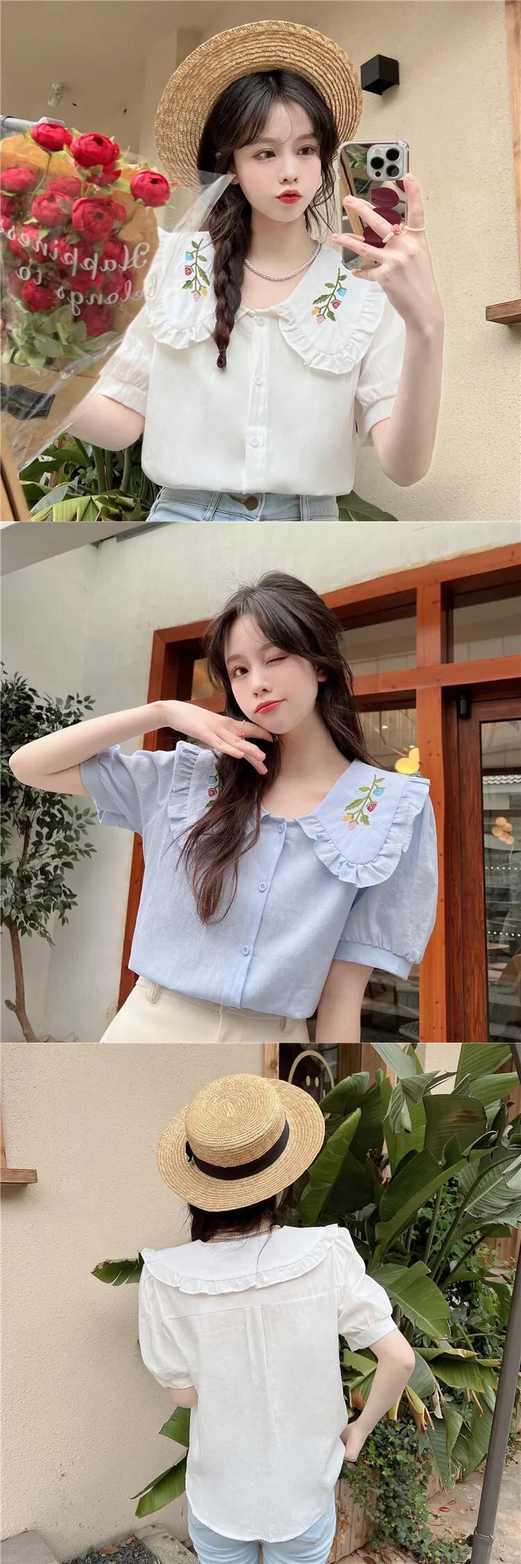 送料無料 アパレル 甘い人形の襟の女性のシャツ夏花柄刺繍半袖ブラウス白青トップス Y2k ホワイト ブルー 大人ガーリー スウィート キュート カジュアル サマー 夏物 AE122232280504328569 | mihatudai(みはつばい)ネットショッピングならmihatudai