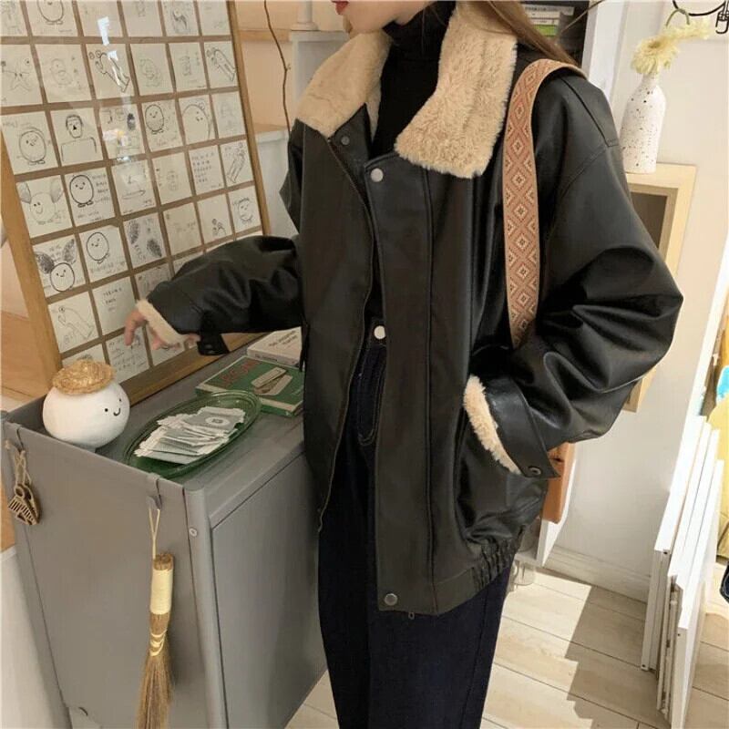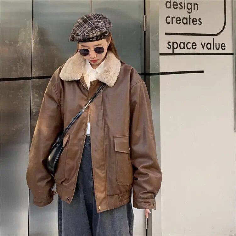 送料無料 アパレル 冬の女性の Pu レザーコートヴィンテージ厚く暖かいモトジャケットふわふわターンダウン襟ボンバー生き抜く服 Y2k ウィンター 冬物 ビンテージ AE122232297456841342 | mihatudai(みはつばい)ネットショッピングならmihatudai