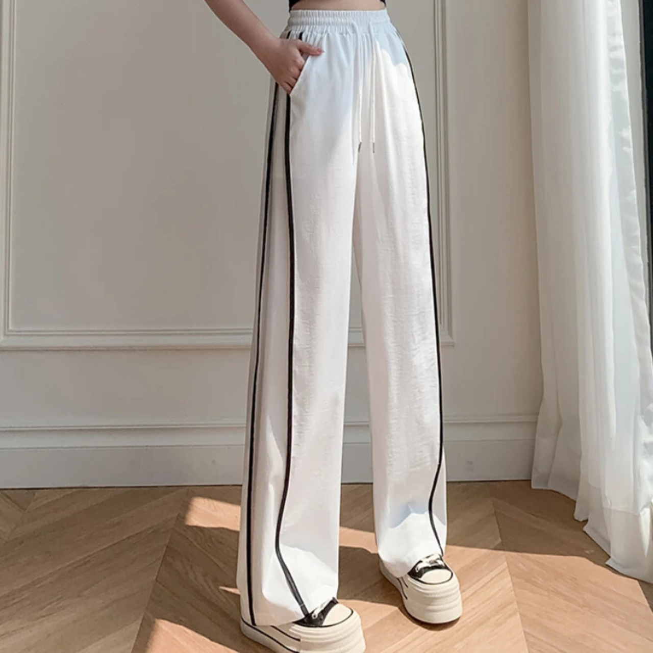 送料無料 アパレル Caausal 弾性ウエストコットンラインパンツサイドストライプワイドレッグズボンサマースポーツストレートスウェットパンツ Y2k エラスティック 伸縮 夏物 ワイドパンツ AE122232297217996416 | mihatudai(みはつばい)ネットショッピングならmihatudai