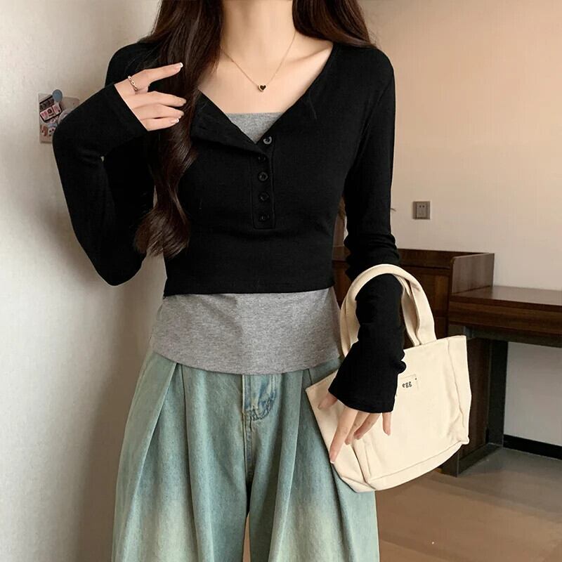 送料無料 アパレル セクシーな偽ツーピースニットトップス女性春秋スタイルカラーコントラストスリムプルオーバー Y2k ボタンセーター服 スプリング 春物 AE12223221920878853 | mihatudai(みはつばい)ネットショッピングならmihatudai