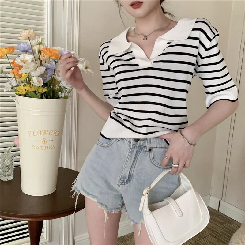 送料無料 アパレル JMPRS スタイルニットストライプ Tシャツ女性の夏 2022 ターンダウンカラー半袖トップスヴィンテージストリート サマー 夏物 ビンテージ AE122232277015937345 | mihatudai(みはつばい)ネットショッピングならmihatudai