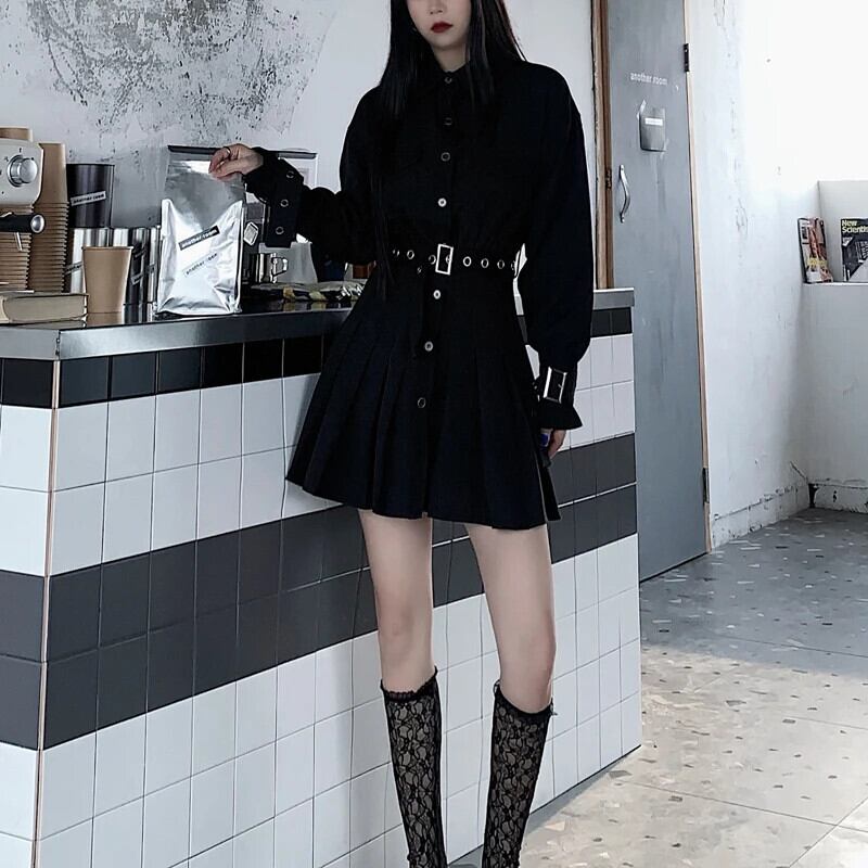 送料無料 アパレル ゴシックボタンアップシャツドレス女性ベルト黒プリーツミニドレス春セクシーなウエスト長袖 Vestidos ロング ブラック スプリング 春物 ハーネス AE122232288576202550 | mihatudai(みはつばい)ネットショッピングならmihatudai