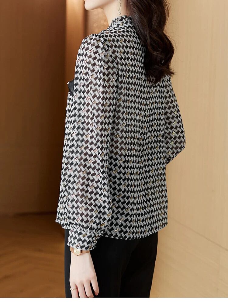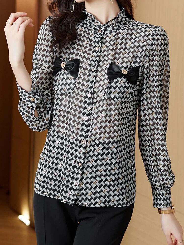 送料無料 アパレル Evnisi Herfst Stand Kraag Plaid Lange Mouwen Vrouwen Enkele Breasted Verstoorde Afdrukken Boog Tops Bodem Veelzijdige ブラウス AE12125556626188834190 | mihatudai(みはつばい)ネットショッピングならmihatudai