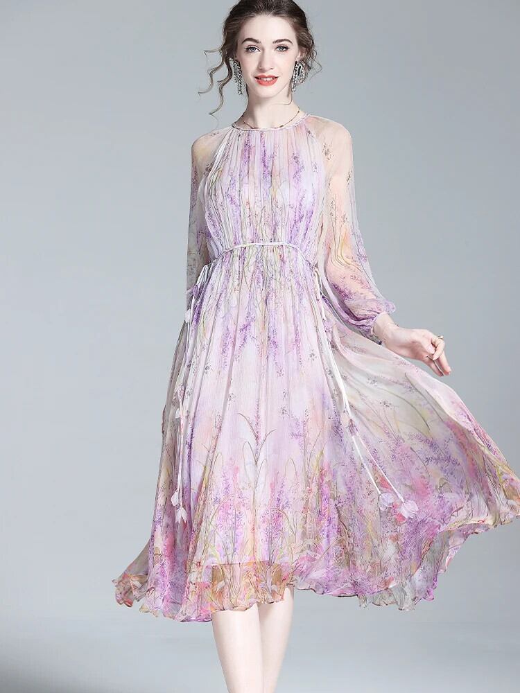 送料無料 アパレル Evnisi Chic Frauen lila Chiffon Kleid O-Ausschnitt loselegante Falten Druck Büro Kleider große Schaukel für Frauen Party Vestido シフォン エレガント AE12125556656481998026