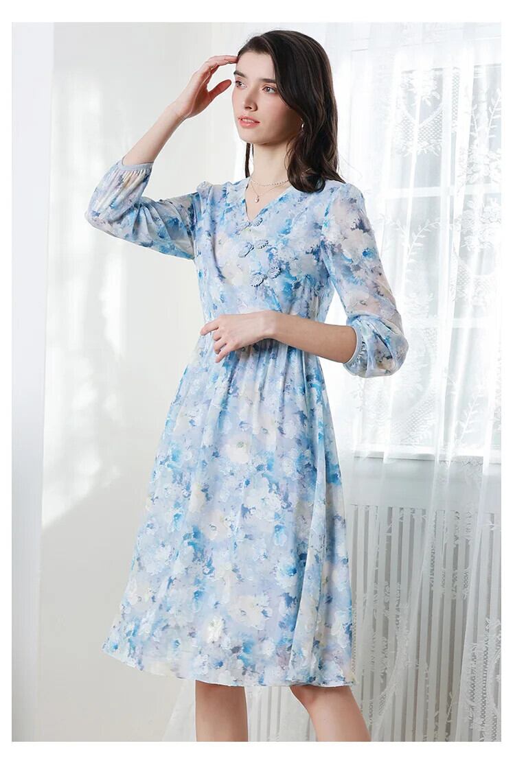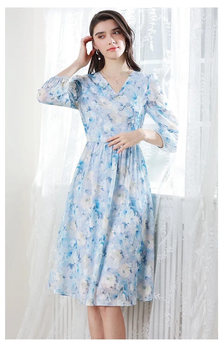 送料無料 アパレル Evnisi Frauen Chic Blumen druck Chiffon Kleid V-Ausschnitt blauエレガントBüro A-Linie Kleider schlank für Frauen Party Vestido Frühling シフォン AE12125556683232545017 | mihatudai(みはつばい)ネットショッピングならmihatudai