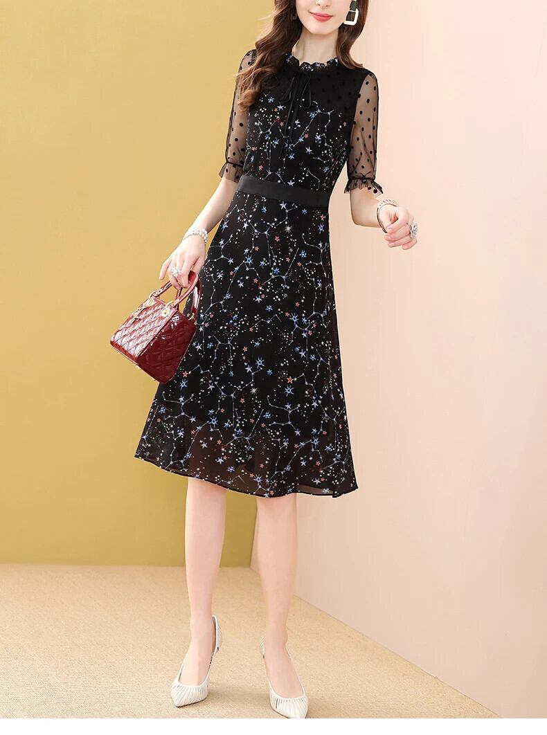 送料無料 アパレル EVNISI Schwarz Drucken Floral Rundhals Kleid Sommer 2022 Neue Frauen Kurzenärmeln Einfache Kleider Chiffon Vestidos シフォン 花柄 AE1212555664890181691 | mihatudai(みはつばい)ネットショッピングならmihatudai