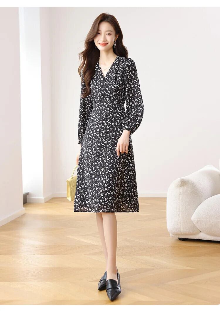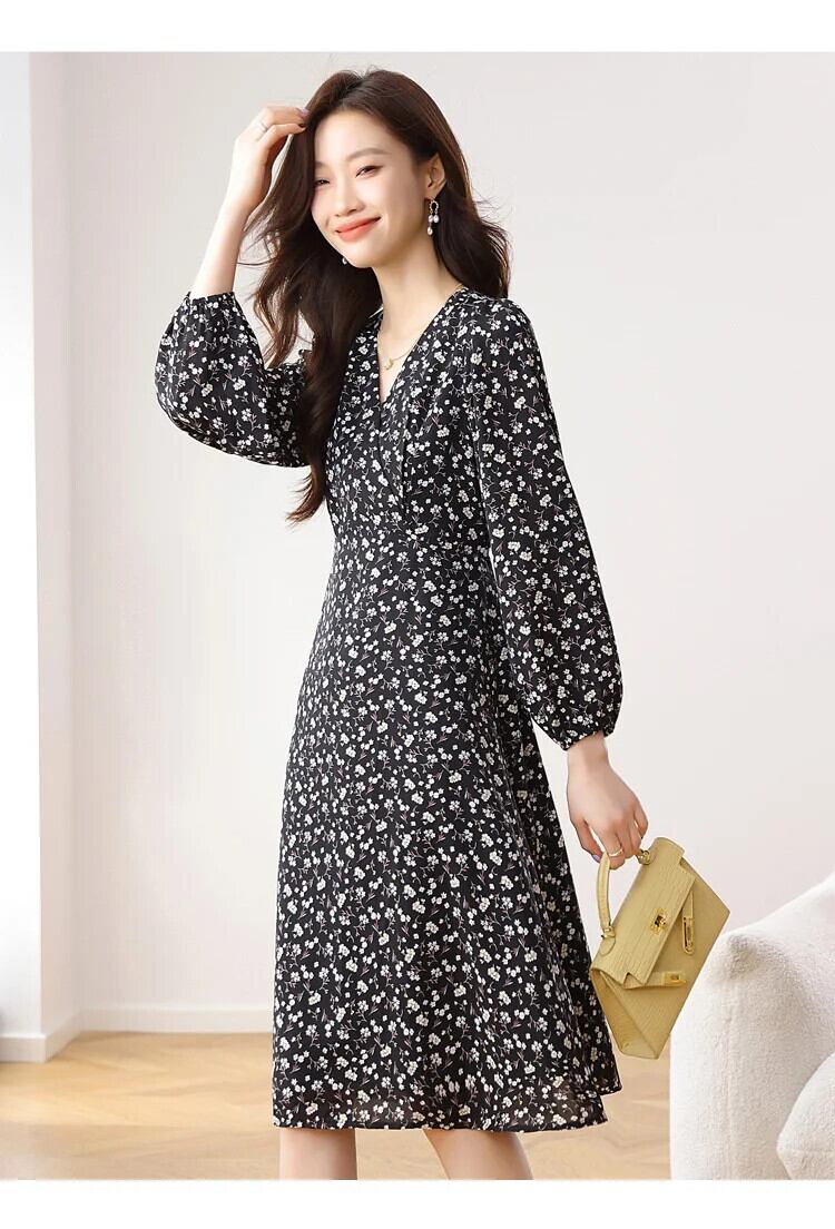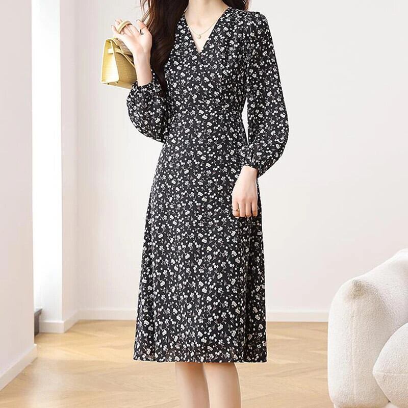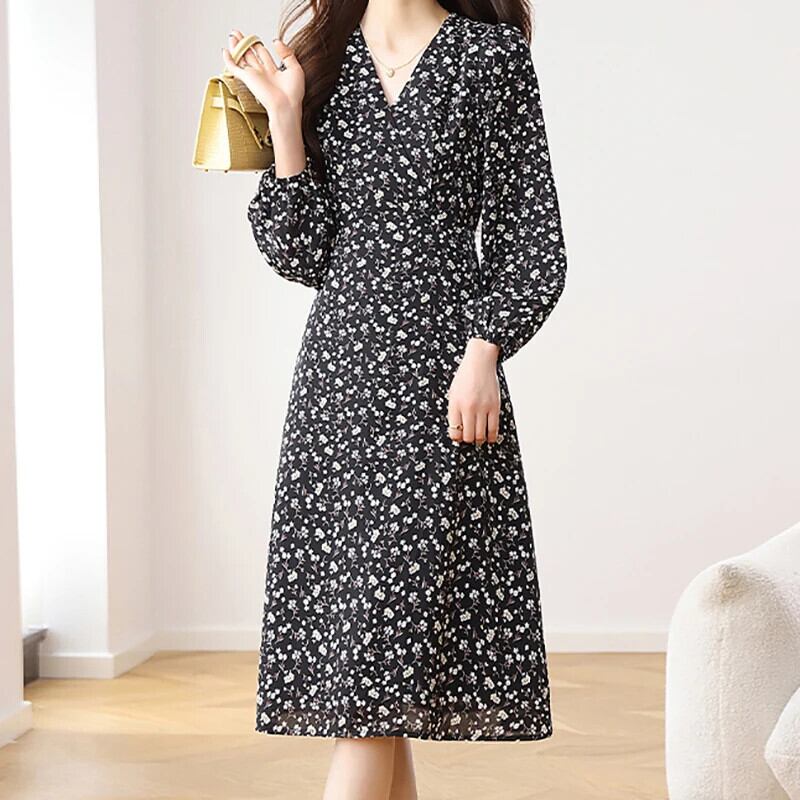 送料無料 アパレル Evnisi Frauen V-Ausschnitt Blumen druck Chiffon Kleid schicke schlanke Büro A-Linie Kleider lange Ärmel Frauen Party Vestido 2024 Herbst シフォン AE12125556679127383640 | mihatudai(みはつばい)ネットショッピングならmihatudai