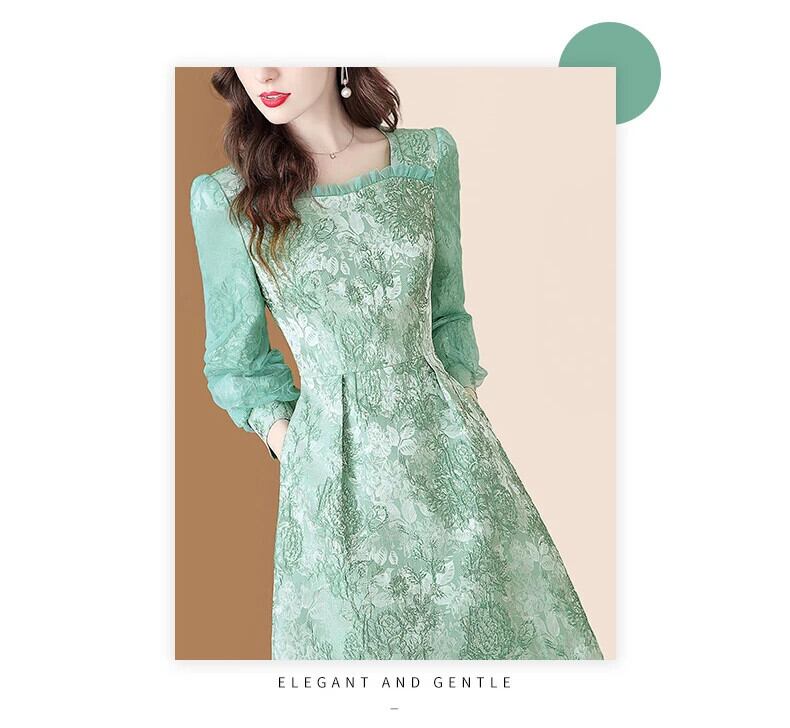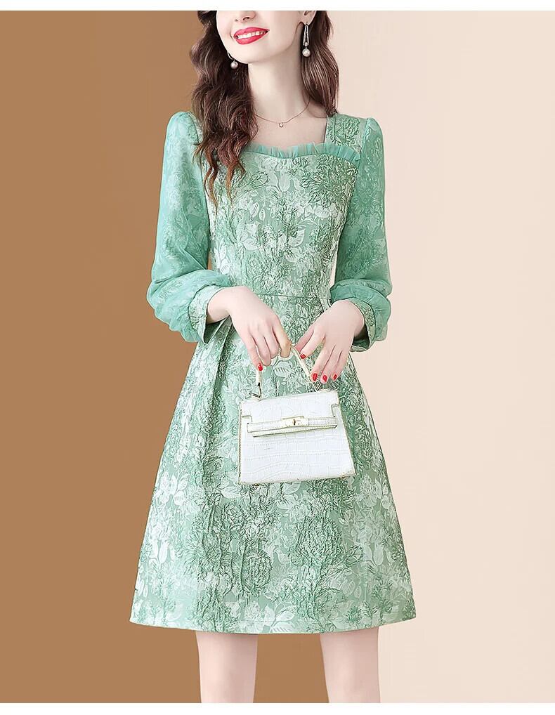 送料無料 アパレル Evnisi Druck Stickerei Kleid für Frauen Winter Rüschen quadratischen Kragen Taille grün Blumen kleiderエレガント Büro Dame Vestidos ウィンター 冬物 AE12125556633294052445 | mihatudai(みはつばい)ネットショッピングならmihatudai