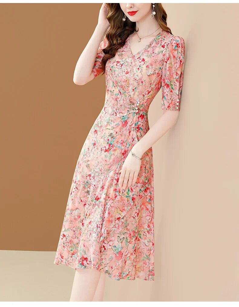 送料無料 アパレル Evnisi Frauen natürliche Seide Chic Chiffon Kleid V-Ausschnitt Frühling Büro unregelmäßige Vestido エレガント Frauen Blumen druck A-Linie Kleider シフォン AE12125556684095783376 | mihatudai(みはつばい)ネットショッピングならmihatudai