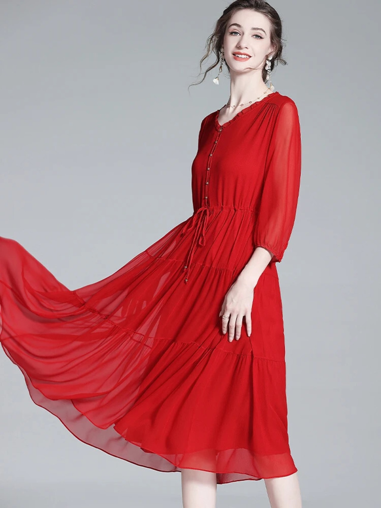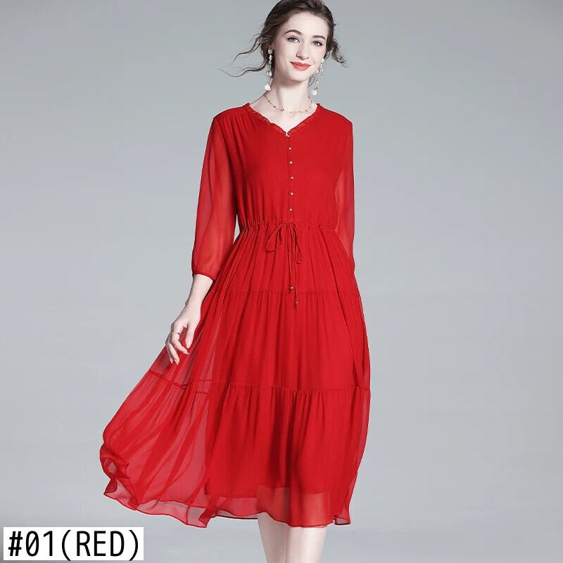 送料無料 アパレル Evnisi rotエレガントe Falten Frauen Chiffon Kleid V-Ausschnitt lang ärmel ige große Schaukel lange Büro kleider für Frauen Party Vestido Sommer シフォン AE12125556619562255627 | mihatudai(みはつばい)ネットショッピングならmihatudai