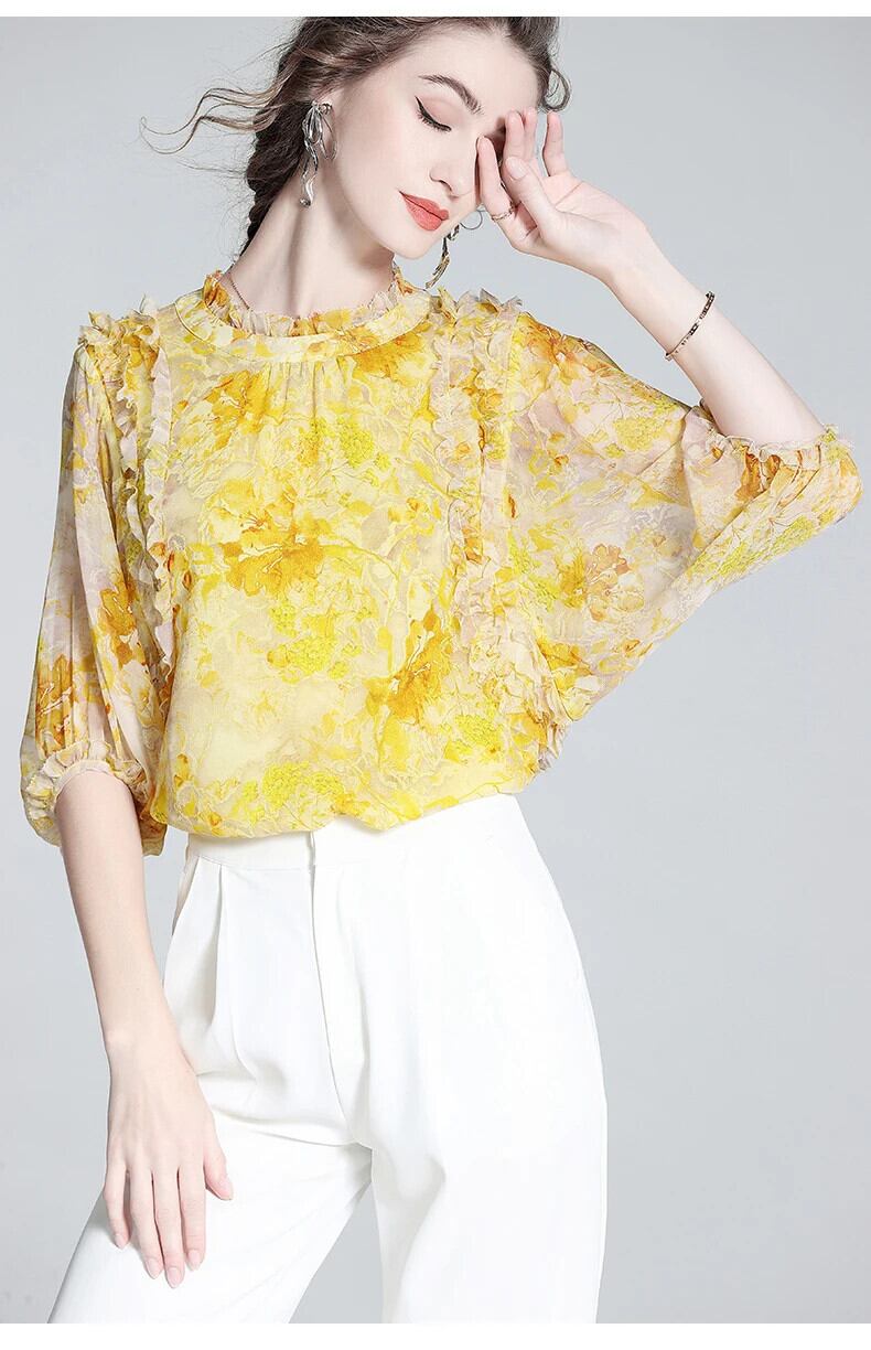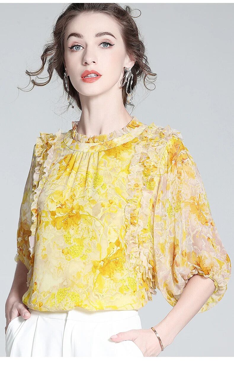 送料無料 アパレル EVNISI Seide Gelb Gedruckt es Hemd 2022 Sommer Neue Rüschen Hals Laterne Hülse Lose Bluse Büro Dame Chiffon Bluse シフォン AE12125556611162689835 | mihatudai(みはつばい)ネットショッピングならmihatudai